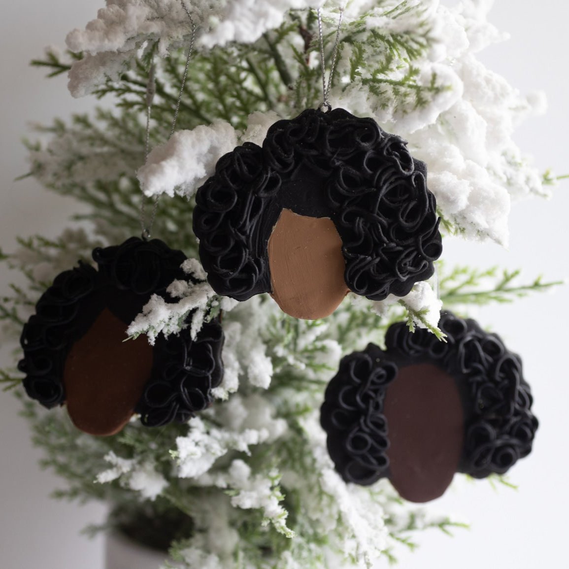 Let your curls shine! Make Christmas memorable with our adorable flowing curl pattern. This hairstyle reminds me of Christmas Dinner with the family at Grandma's. Each ornament is specially designed with love and care. Celebrate the curls and coils you were born with. Choose from 3 different skin tones. Each ornament is handcrafted so designs will vary slightly.