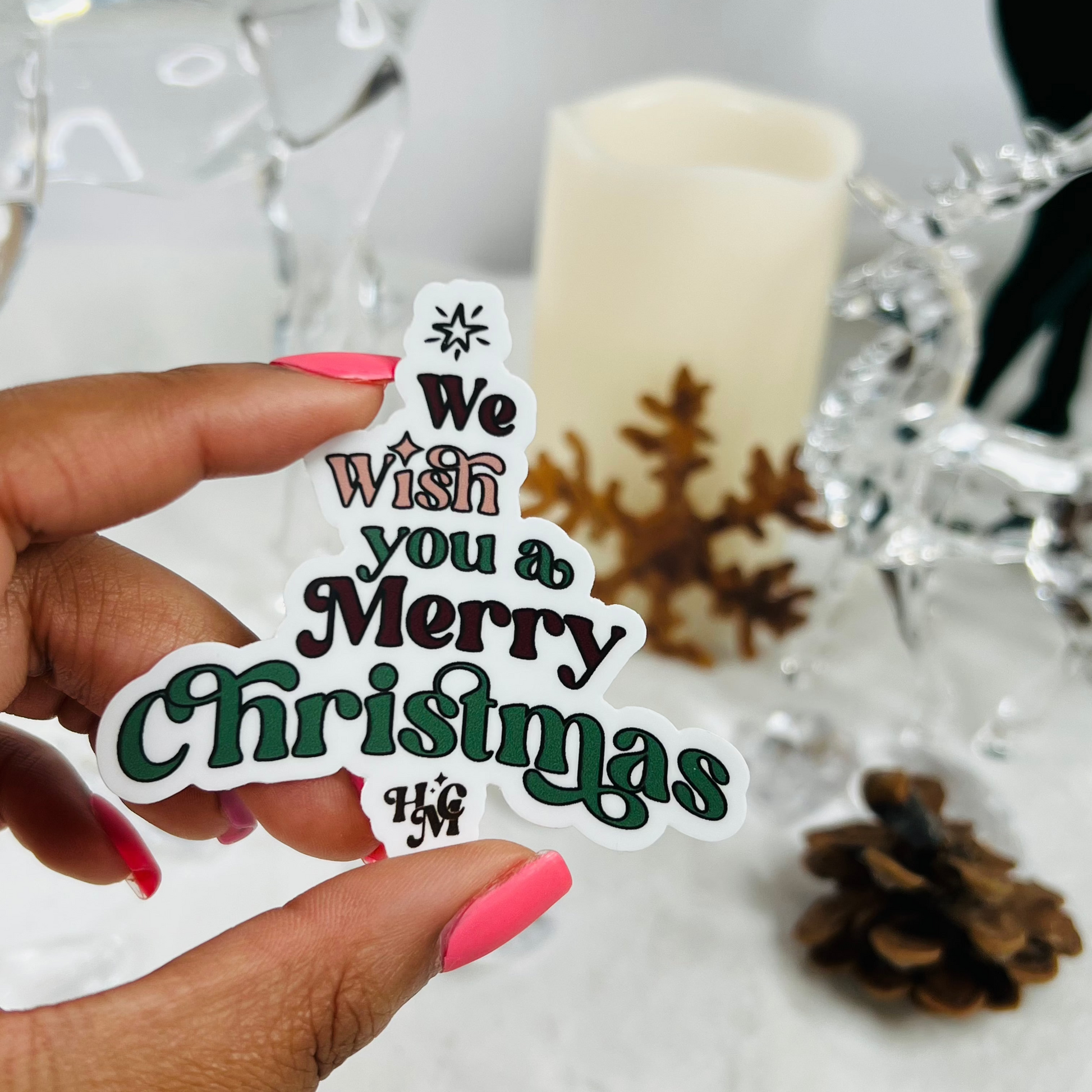 A classic holiday song. The words" We Wish You A Merry Christmas" forms a Christmas tree decked in gorgeous pink, wine, and green colors. A star twinkles as the topper. A modern twist to a holiday staple and favorite.